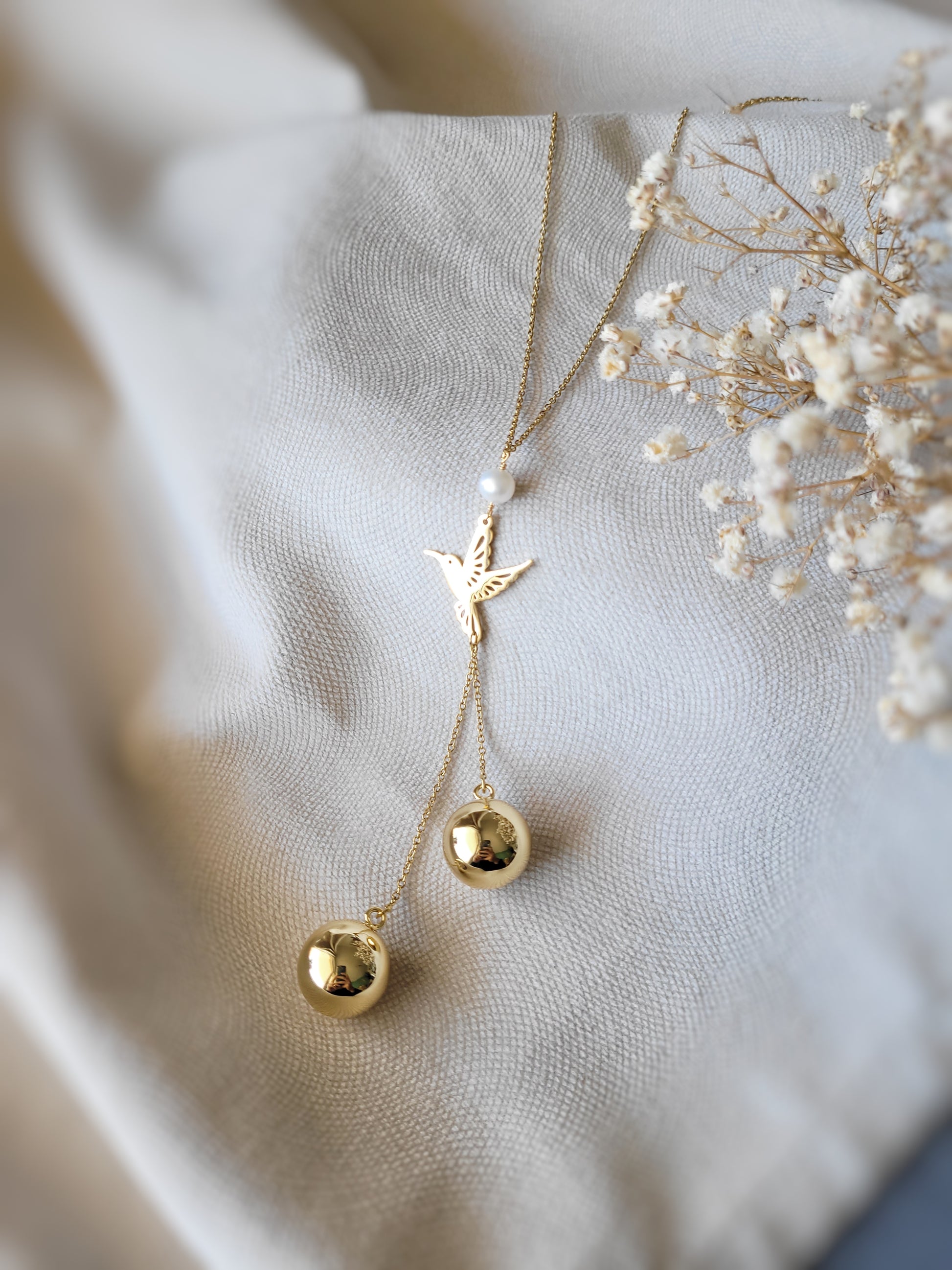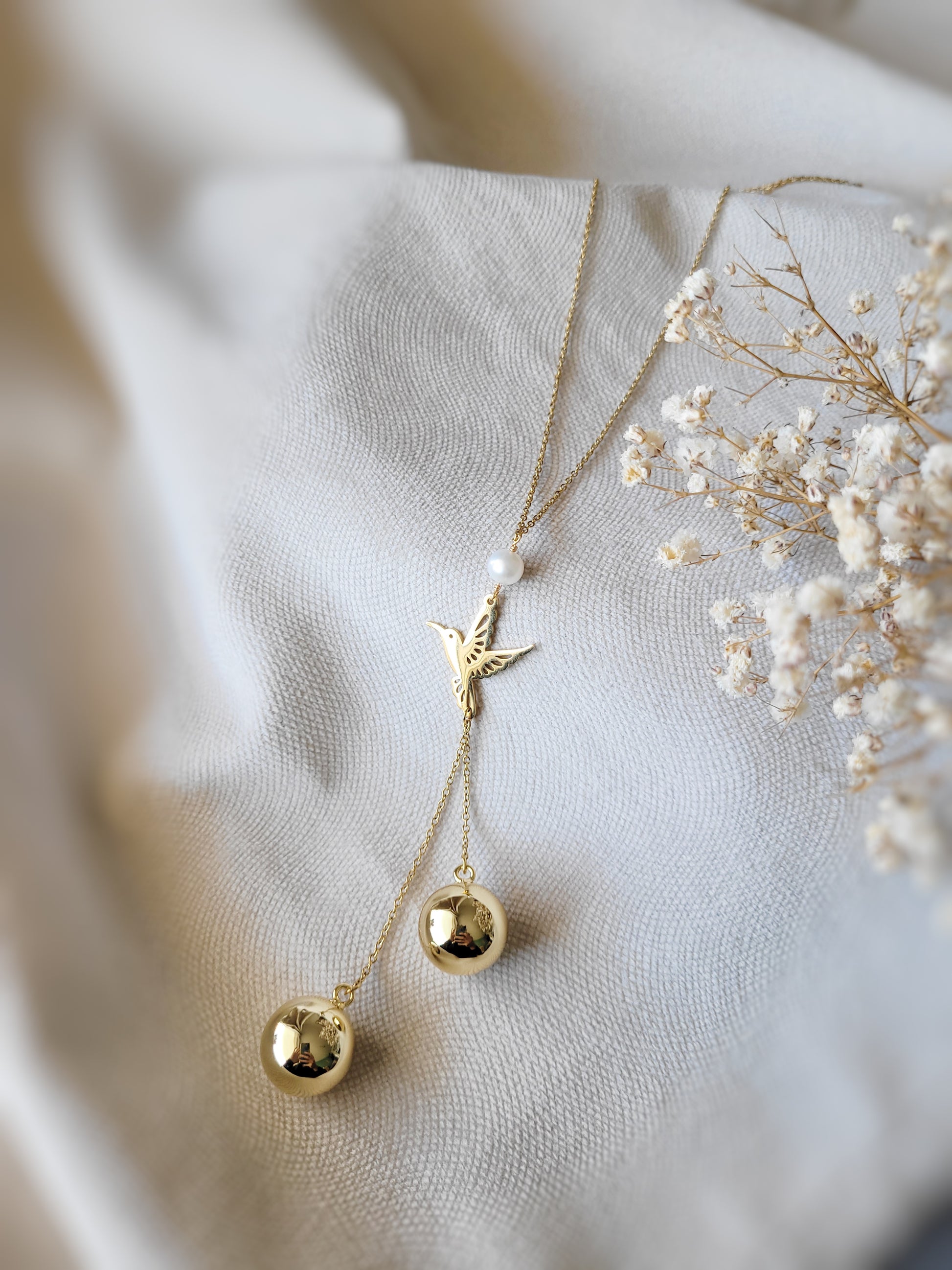 Ce bola de grossesse pas comme les autres a été imaginé pour célébrer une grossesse gémellaire. Il est composé de deux boules de bolas suspendues, symbolisant chacun des bébés à venir, et d’un colibri délicat, messager de vie et symbole d’espoir dans les parcours de PMA (procréation médicalement assistée).