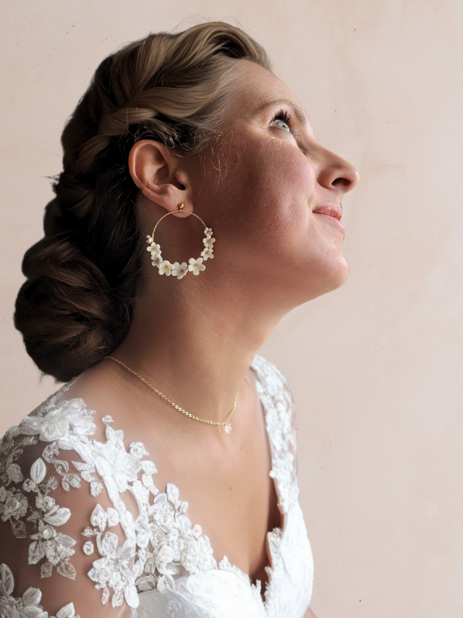 Leur cercle fin en laiton doré à l'or fin 24 carats, rehaussé de petites fleurs en porcelaine blanche modelées à la main, apporte une touche de douceur naturelle et lumineuse à votre visage.
